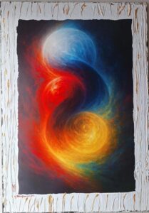 Dieses einzigartige Kunstwerk entstand durch die innovative Kombination traditioneller künstlerischen Techniken und moderner KI-Technologie. Der Prozess begann mit der Idee, Auswahl und Vorbereitung der analogen Materialien, Leinwand, Farben und Werkzeuge sowie KI und entsprang einer tiefen Meditation in einer großen Umbruchzeit